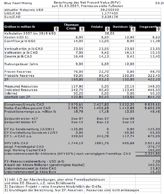 Die Bewertung von Blue Pearl Mining, nähere Ausführungen zum Rechenmodell