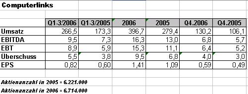 Das Geschäftsjahr 2006 sei das bisher erfolgreichste Jahr in der Unternehmensgeschichte der COMPUTERLINKS AG gewesen. Für alle wichtigen Kennzahlen würden sich erhebliche Wachstumsraten gegenüber dem Vorjahr ergeben. Der Konzernumsatz habe sich um 42% auf 396,7 Mio. Euro gesteigert (Vorjahreszeitraum: 279,4 Mio. Euro).
