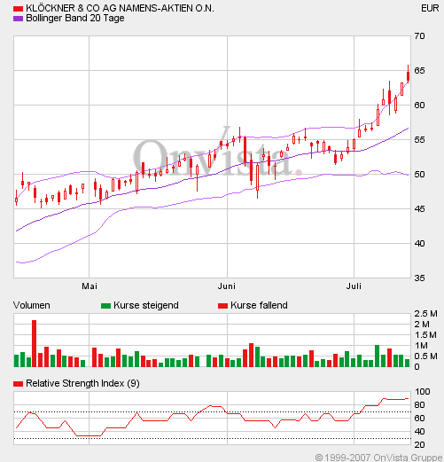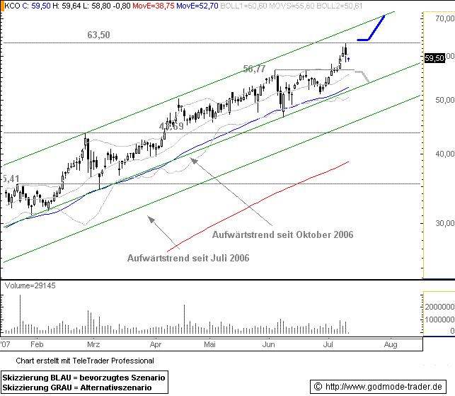 Kurz-Kommentierung: Die KLÖCKNER & CO Aktie befindet sich seit einem Tief bei 13,87 Euro vom 15.07.2007 in einer stetigen Aufwärtsbewegung. Innerhalb dieser Bewegung konnte die Aktie vor wenigen Tagen ihr letztes Verlaufshoch bei 56,77 Euro nach oben durchschreiten und ein neues Allzeithoch bei 63,50 Euro erzielen.