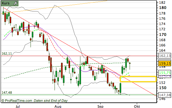 Aber nicht mehr lange. Da ist ein Gap offen – und nach bestätigtem Ausbruch sieht's ehrlich gesagt nicht aus. Ich halte Allianz für einen der Kandiaten, die nach der Zinsentscheidung zwar angesprungen sind, aber noch nicht entgültig. Das "gibt's sicher wieder für 152€" bezieht sich demnach auf fallende, nicht steigende Kurse. Je nach dem also ein Kauflimit bei 152€ setzen.