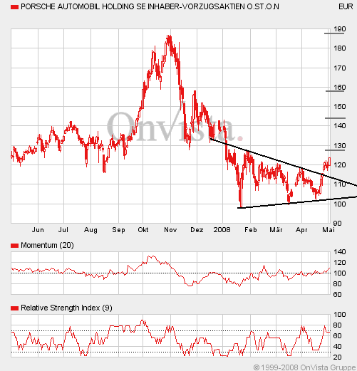 "...Fällt der Kurs nun nicht mehr nachhaltig unter 114,40 Euro zurück, stehen die Chancen gut, dass PORSCHE mit einem Ausbruch über 127,70 Euro ein weiteres Kaufsignal generieren kann. Eine neue Kaufwelle bis auf 152,90 Euro wäre dann möglich...."