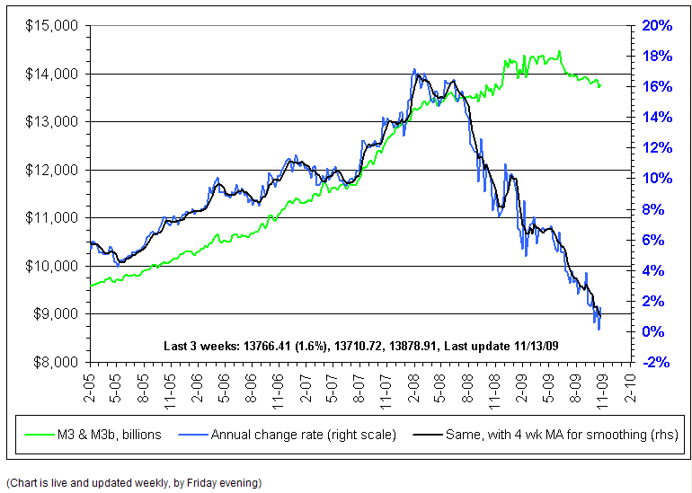 Goldpusher nennen auch oft das billige Geld und in Folge dessen die erhöhte Geldmenge als Grund für eine Hyperinflation. Das ist natürlich Blödsinn, denn mit Krisenbeginn fiel die M3-Menge rapide, was ja geldpolitisch ein völlig normaler Vorgang ist. (Bild unten)