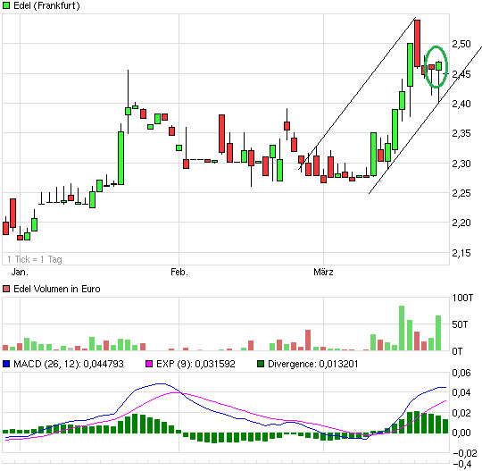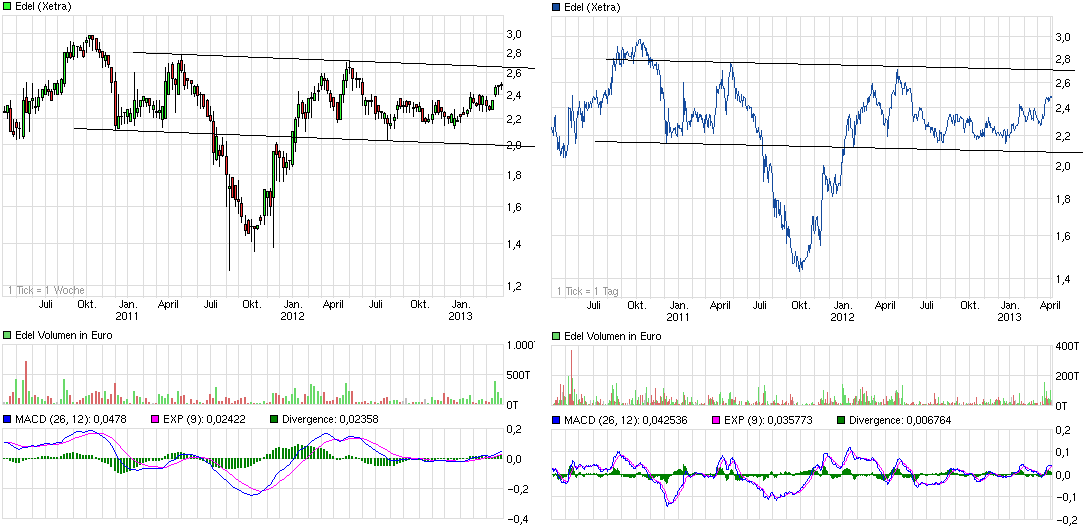 Der Gewinnmotor stottert aktuell doch recht deutlich und der Preis- bzw. Margendruck scheint an Tempo zu gewinnen. Damit steigt das Risiko an, daß EDEL auch dieses Jahr wieder mal die Gewinnprognose für das Gesamtjahr nicht erfüllen kann. Also als Kurstreiber kann man diese Zahlen nun nicht sehen. Solange der CEO Haentjes weiter den Wert nur im eher kapitalmarktfeindlichen intransparenten Minimalstandart Entry Standard notieren läßt anstatt im Prime Standart, solange dürfen weiterhin die meisten institutionellen Anleger eh die Aktie nicht kaufen, da diese Aktie den Minimalstandart der Mindestrichtlinien nicht erfüllt für Werte in die man investieren darf. Aber ich schätze das ist dem Haentjes weiterhin relativ egal, da er ja eh keine Absicht hat auf absehbare Zeit seinen Bestand zu reduzieren. Leider dümpelt der Aktienkurs nach seinem Extremabsturz vor einigen Jahren weiter nurnoch in den 2,xx Niederungen rum. Und solange der Gewinn nicht mal wieder nachhaltig anzieht und der CEO Bemühungen macht die Aktie auch für instit. Anleger mal wieder kaufenwert zu machen, solange wird es wohl schwer bleiben mehr als nur eine 2 vor dem Komma beim Kurs zu sehen.