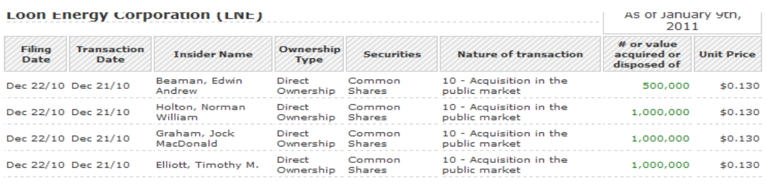Am 7.1.2011 brachte Loon Energy eine Meldung heraus (sie erscheint noch nicht auf der homepage) und deklarierte diese Aktion als "Ausgabe von Aktien für erbrachte Dienste":