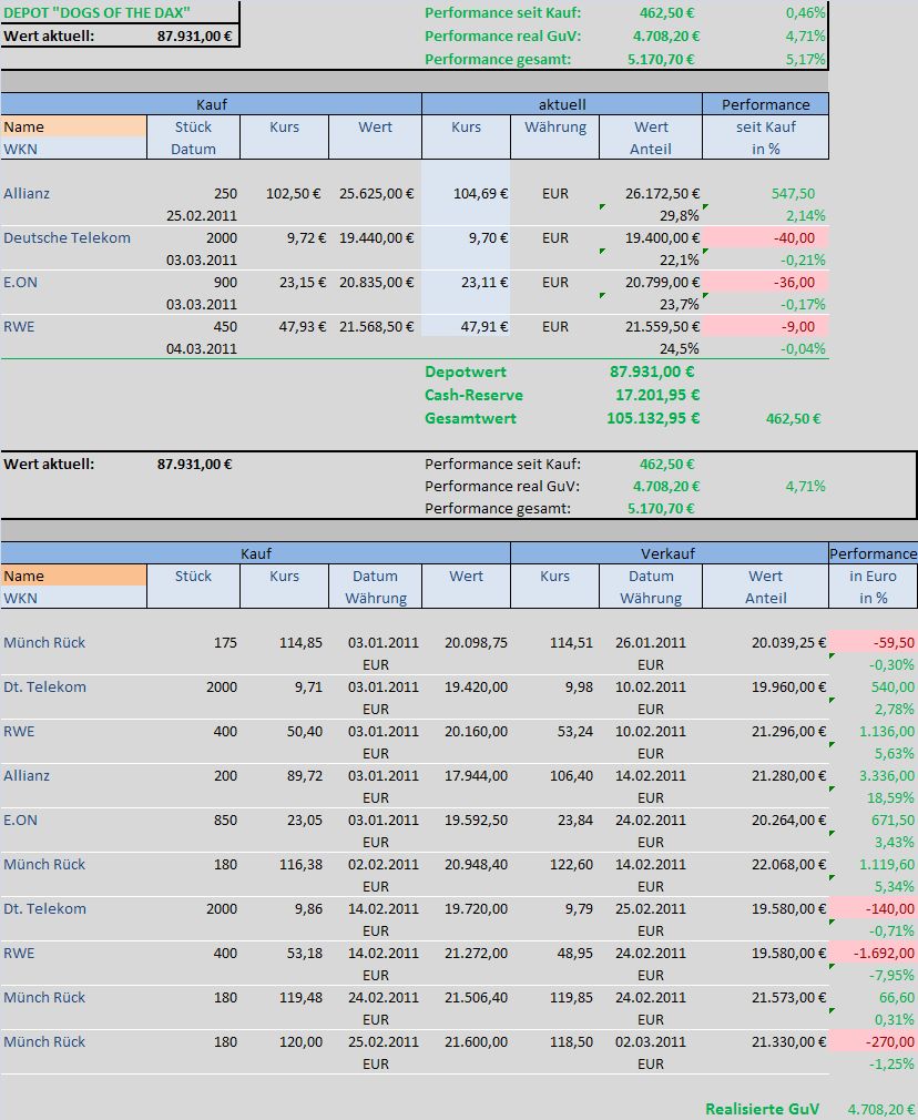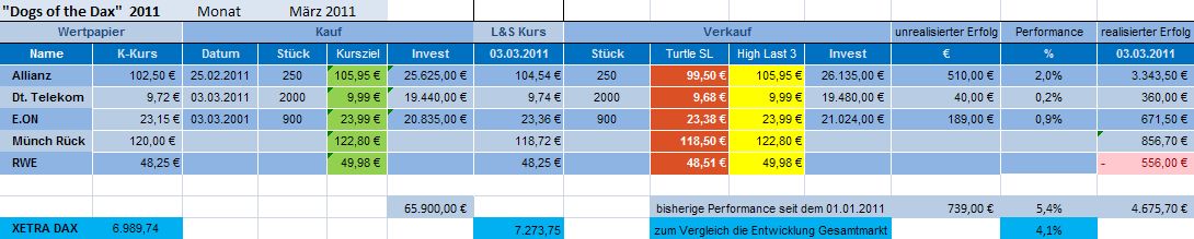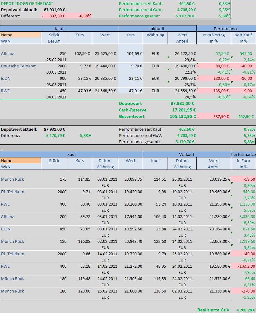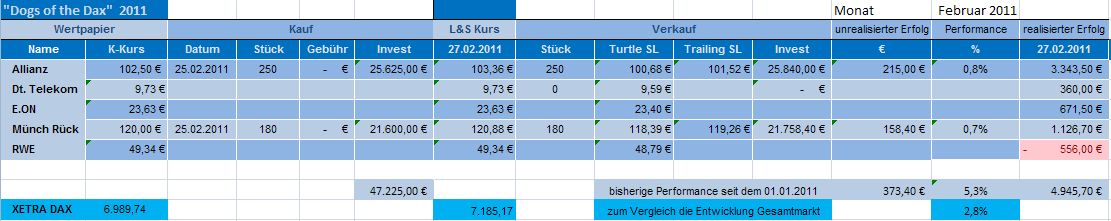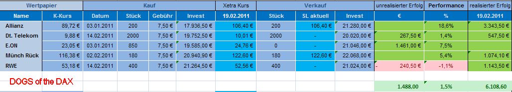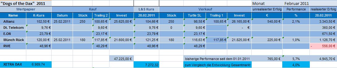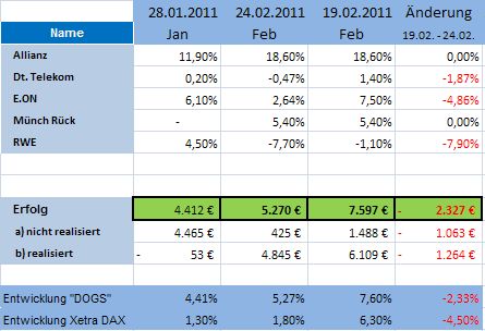 Insgesamt konnte das Depot „DOGS oft he DAX“ an der heutigen Gesamtentw­icklung des DAX nochmals reüssieren­. Es liegt seit dem 01.01.2011­ und mit Monatsabsc­hluss Februar 2011 mit 5,7% weiterhin über der Performanc­e des DAX mit 4%. Damit schlägt das Depot auch im zweiten Monat den DAX.