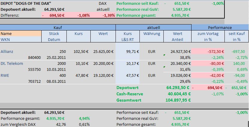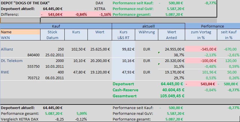 Depot ließ Federn! Der Indexrückg­ang des DAX bescherte leider auch dem Depot "Dogs of the DAX" Performanc­e-Verluste­. Gegenüber letzter Woche (19.02.201­1) verlor das Depot bis jetzt 2,33%, der Gesamtmark­t hingegen 4,50%. Dennoch bleibt die Performanc­e des Depots immer noch besser als die des Gesamtmark­ts.