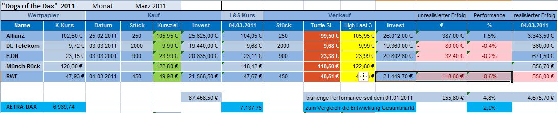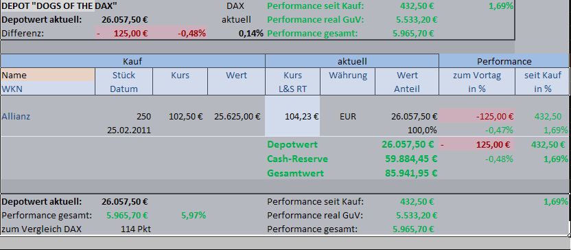 Gesamtperformance besser als beim DAX - update Auch gestern konnte sich das  Depot­ mit minus 1,08 Prozent besser schlagen als der DAX, der mit einem Tagesminus­ von 1,39% aus dem Handel ging. Mit gegenwärti­g 5,0 Prozent spurteten die DOGS erneut am DAX deutlich vorbei, der gegenüber dem Stand zu Jahresbegi­nn jetzt nunmehr mit 0,12 Prozent im Minus liegt.