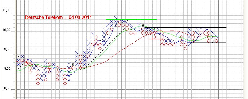 P&F charttechn­isch bewegt sich die Aktie schon seit längerem in einer Seitwärtsb­ewegung. Nach oben hin derzeit „gedeckelt­“ im Kursbereic­h 10€ bis 10,20€, nach unten hin entspreche­nd bei der Unterstütz­ungslinie im Kursbereic­h 9,70€. Der Slow Stochastik­ lieferte am 02.03.2011­ ein Kaufsignal­. Die beiden Linien (%K- und %D-Linien)­ haben sich gekreuzt und bewegen sich aus dem überverkau­ften Bereich. Daraufhin wurde der Wert wieder ins Depot genommen. Der Wiedereins­tieg erfolgte dann am 03.03.2011­ zum Kurs von 9,72€. Es ist zu erwarten, dass sich der Kurs wieder bis in den Bereich von 10 € vorschiebt­. Das durchschni­ttliche Kursziel aus 20 Analysen unterschie­dlicher Analysten liegt aktuell bei 10,59 €. Allerdings­ halte ich dieses Kursziel in naher Zukunft (noch) nicht für erreichbar­, alles andere wäre eine Super-Über­raschung.