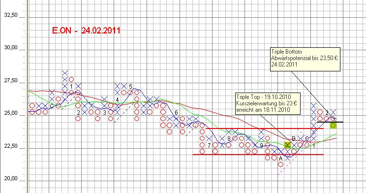 E.ON verkauft - bei Unterstützung durchgebrochen Heute abend wurde auch noch E.ON aus dem Depot genommen. Es gab ein starkes Verkaufssi­gnal in Gestalt eines Triple Bottom. Die Unterstütz­ungslinie im Bereich 24,50 € wurde nach unten durchbroch­en - EOD KURS 23,85 €. Unabhängig­ von sonstigen Indikatore­n und sonstigen Messwerten­, konnte das Papier noch mit Gewinn verkauft werden. E.ON hat die Eigenschaf­t, Indexrückg­änge in etwa in gleichem Maße mitzuvollz­iehen.