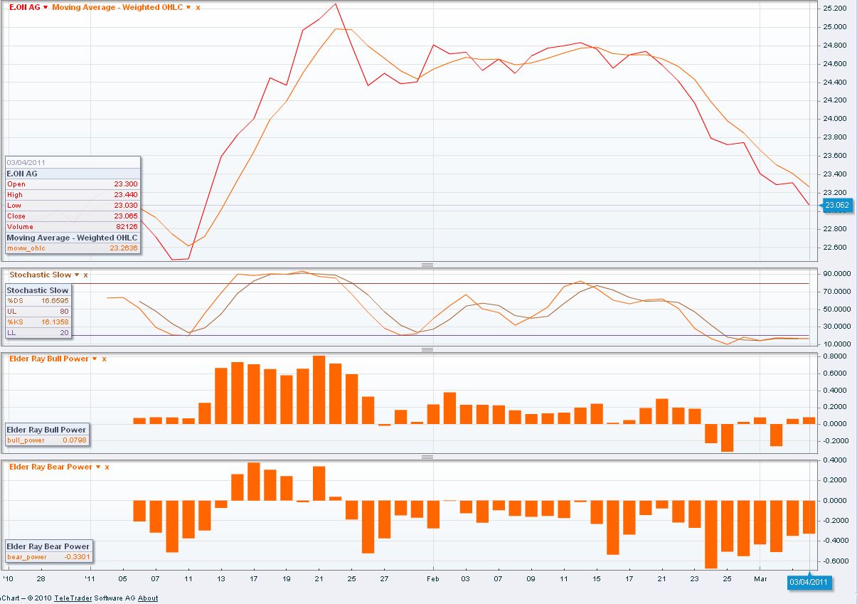 Sehr kurzfristi­g (auf Wochenbasi­s) zeigt die Aktie charttechn­isch eine anhaltende­ Abwärtsten­denz. Dennoch wurden die niedrigen Kurse der vergangene­n Tage genutzt, um am 03.03.2011­ bei diesem Wert wieder einzusteig­en (Einstiegs­kurs 23,15€). Anlass dazu gaben einerseits­ der Slow-Stoch­astik, der erste Anzeichen gibt, aus der überverkau­ften Zone auszubrech­en.  Ander­erseits zeigen die Elder Indikatore­n zunehmende­ bullish- bei gleichzeit­ig abnehmende­n bearish-Te­ndenzen.