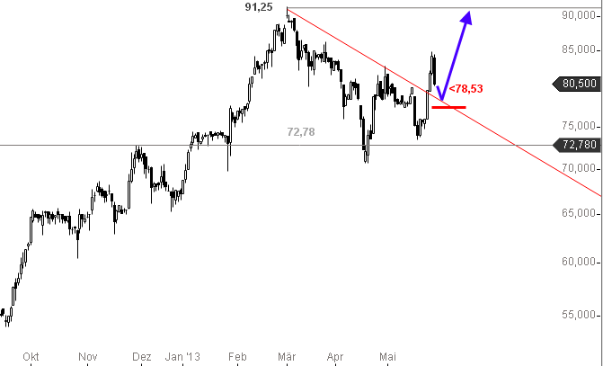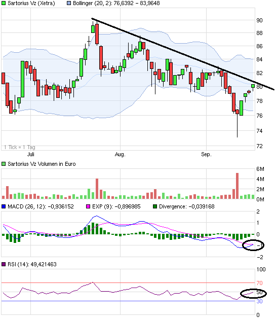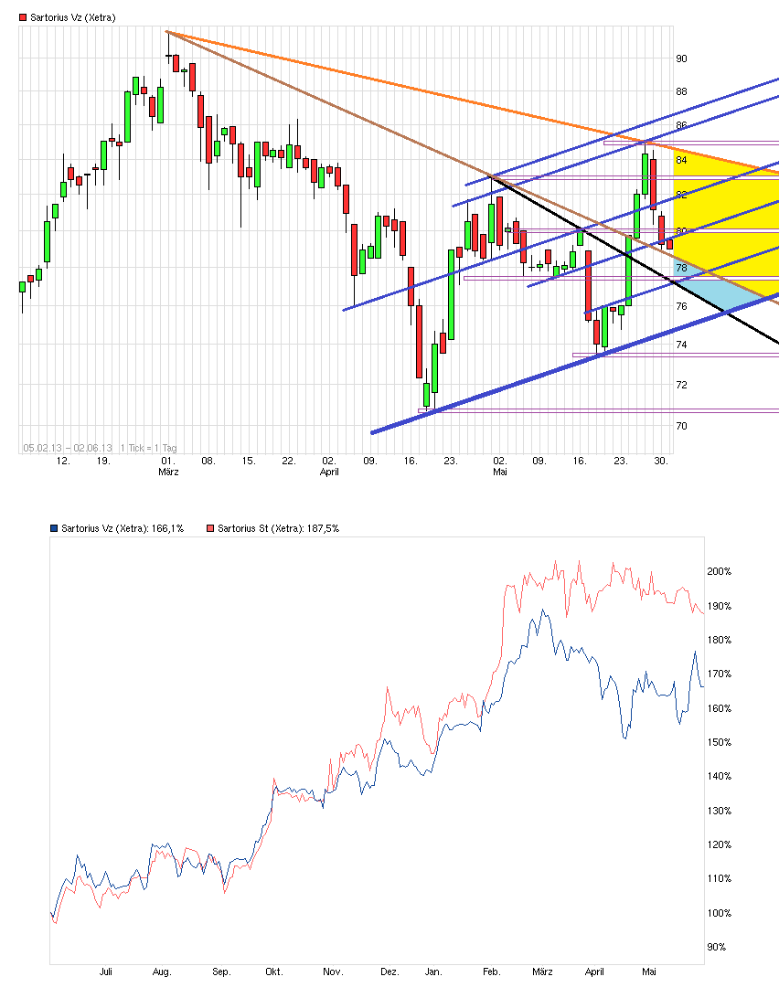 Auszug aus GMT von heute - www.godmode-trader.de - 29.05.2013, 16:01 Uhr => "...Die Aktie von Sartorius Vz. brach am Montag über den Abwärtstrend seit März 2013 nach oben aus. Im heutigen Handel fällt der Wert etwas zurück. Dieser Rückfall ist als Pullback an den gebrochenen Abwärtstrend zu sehen. Dieser Trend liegt bei 78,53 Euro. Spätestens dort sollte der Wert wieder nach oben drehen. Anschließend ist eine Rally in Richtung des Allzeithochs bei 91,25 Euro zu erwarten. Sollte der Wert allerdings unter 78,53 Euro per Tagesschlusskurs zurückfallen, könnte eine größere Verkaufswelle einsetzen..."
