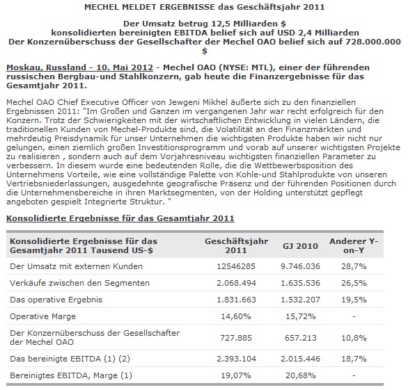 Der Nettogewinn im Jahr 2011 stieg auf $ 727.900.000 von 657.200.000 $ im Vorjahr, teilte das Unternehmen mit. Aktionäre, die am 22. Mai, 12 halte, sind berechtigt, den Dividendenvorschlag von 8,06 Rubel pro Stammaktie und 31,28 Rubel pro Vorzugsaktie bei der am stattfindenden 29. Juni Hauptversammlung auszuüben.