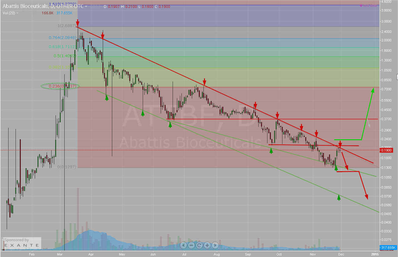Abattis führt mit einem Kursplus von 35,71% die Gewinnerliste in KW 48 an. Charttechnisch befindet sich ATTBF an einer nun sehr wichtigen Entscheidermarke für den weiteren Verlauf, nämlich am langfristigen Abwärtstrend der aktuell zur Disposition stehen könnte. Rein von der Zyklik her sollte auf aktuellem Niveau ein Abverkauf folgen, da der langfristige dominierende Abwärtstrend mittelfristig agierende Swingtrader auf den Plan rufen dürfte. Erst Kurse > 0,24$ konnten den sich evtl. gerade bildenden bullischen Keil triggern- Kurse von 0,7 wären die Folge einer solchen Keilauflösung (dies entspräche der Minimalkorrektur nach Fibos), aber natürlich rein theroretischer Natur :-)