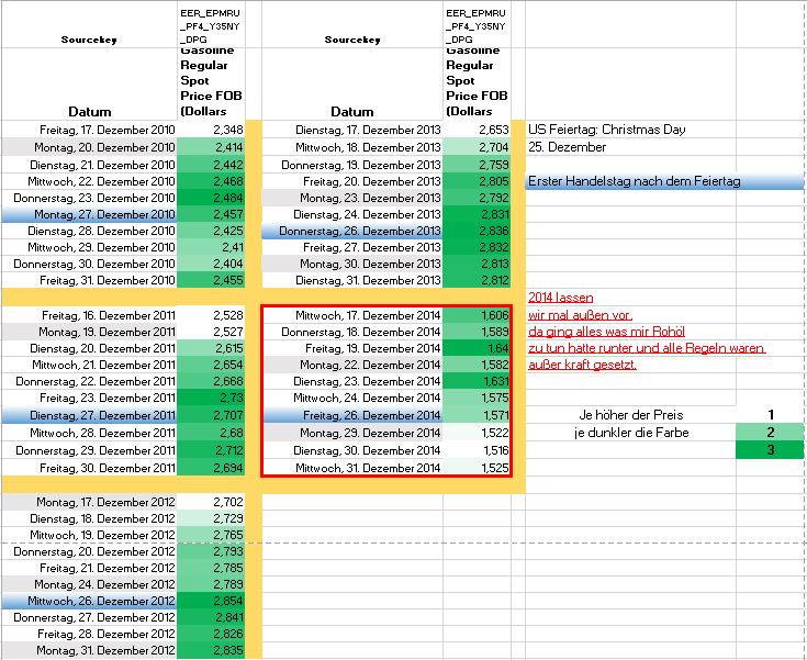 Wenn die OPEC den Rohölpreis am 4. Dezember nicht in den Keller schickt dann habe ich hier eine Handels Idee für die Weihnachtstage. So entwickelte sich der Benzinpreis in den letzten Jahren um die Weihnachtstage herum.