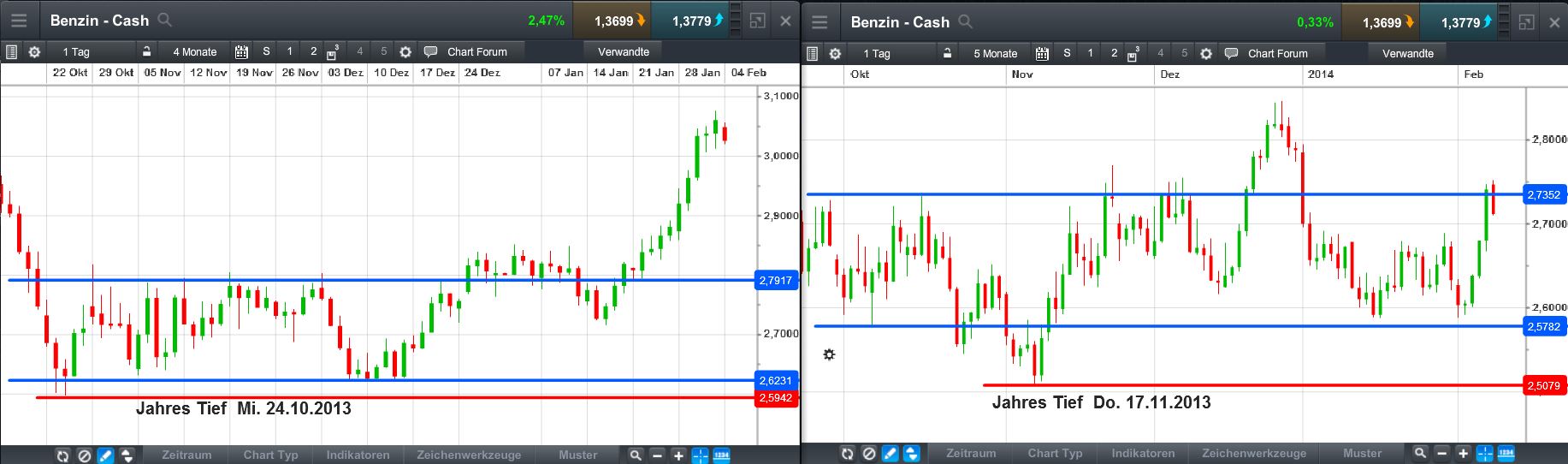 So genau kann keiner sagen wo das Monats Tief liegt. Aber in der Zeit von Oktober bis Januar läuft Benzin in einer Range und da kaufe ich im unteren Range Bereich nach und irgendwann ab Januar/ Februar bricht der Kurs nach oben aus. Also die unteren Punkte der Range sind für mich Kaufpunkte und die nenne ich Monats Tief. Diese Monats Tiefs liegen meistens in der ersten Monatshälfte und sind häufig an einem Freitag oder Montag.