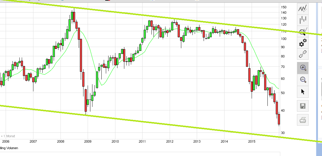 "So lange keine Trendwende nach oben hin auf Wochenbasis stattfindet, besteht durchaus noch die Gefahr weiter fallender Kurse bis in den Bereich bei 23,00 - 24,00 oder langfristig 17,00 - 18,00 USD"