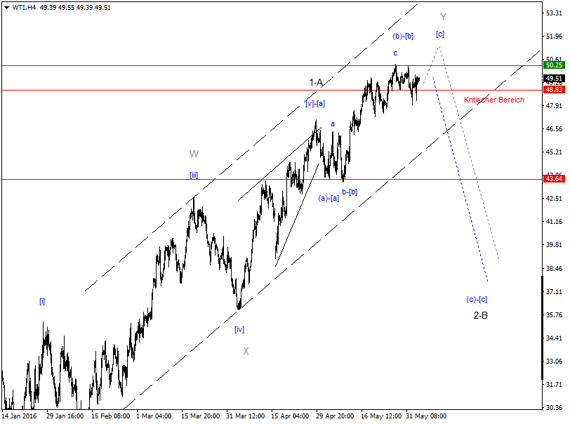Wti hat zwar Kritischen Bereich durchbrochen, aber wir sehen keine Dynamik nach unten deswegen ist es nicht ausgeschlossen das es noch ein neues Hoch gibt. Bin persönlich noch nicht im Markt. Es gibt noch eine Alternative fals neu Hoch kommt dann war das Höchstwahrscheinlich blos ein ZZ im Rahmen der Korrektur der Welle [ii]. Dann kommt Ziel in den Bereich von 25.