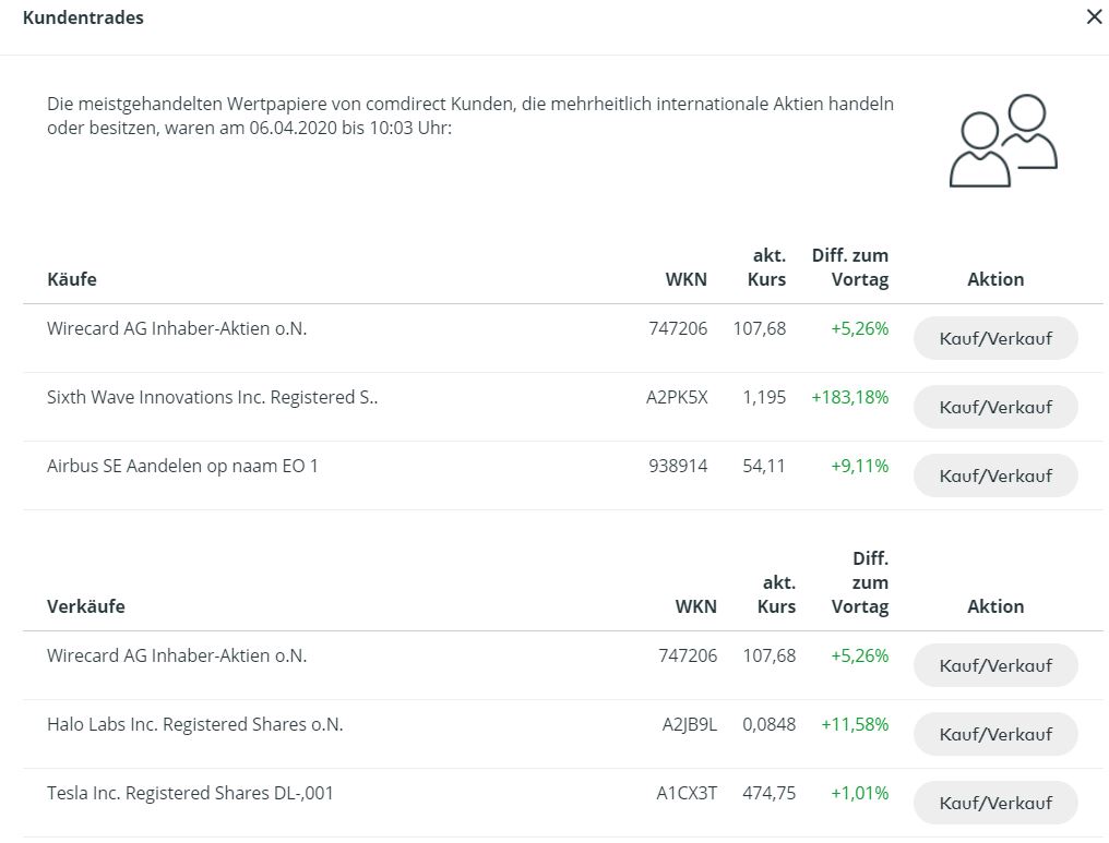 Anbei aktueller Screenshot der Top-Trades der comdirect-Kunden - Sixth Wave zwischen Wirecard und Airbus - da geht richtig was.
