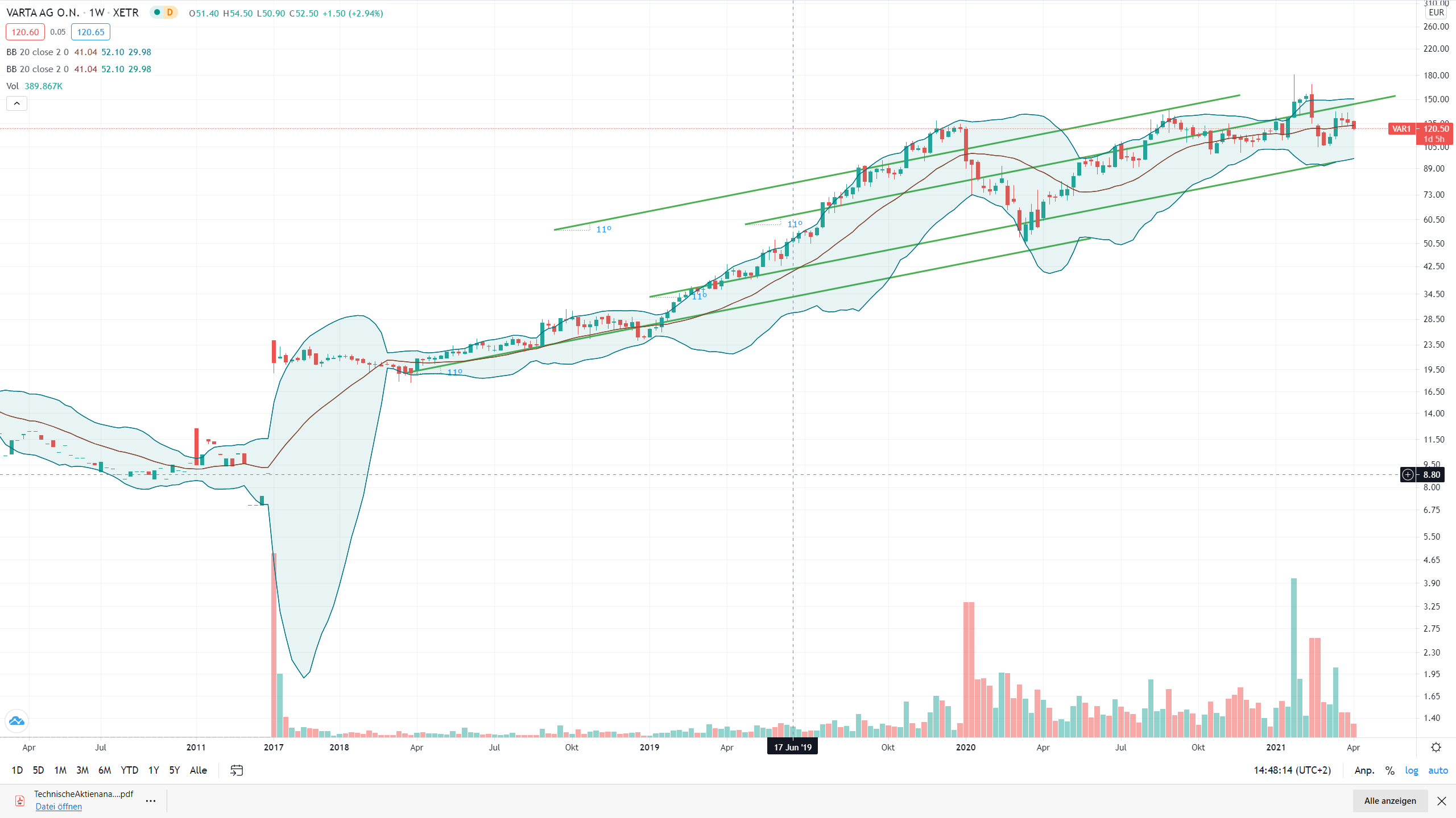 Prolongiert man die Bollingermitte Stand heute mit einem Steigungswinkel von 11Grad, ergibt sich ein Target von 138,55€, das high zu 169,95 €, tief zu 107,60 €.
