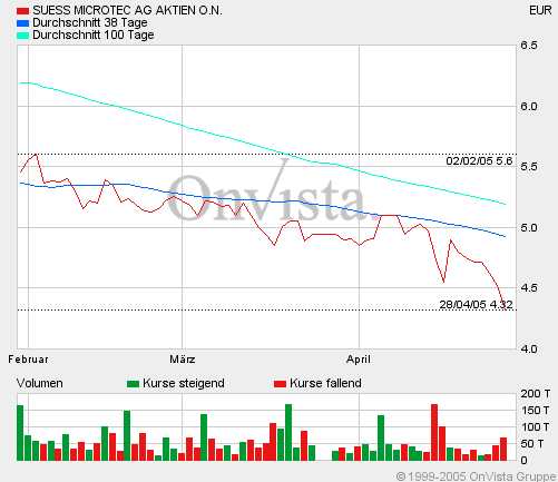 GARCHING (Dow Jones-VWD)--Die Süss MicroTec AG, Garching, rechnet im Gesamtjahr 2005 mit einem Umsatz auf Vorjahresniveau, sieht die Einnahmen im laufenden zweiten Quartal aber unter dem Niveau der entsprechenden Vorjahresperiode von 26,6 Mio EUR. Der Rückgang liege im Produktmix beim Auftragseingang begründet, teilte das Unternehmen am Dienstag nach Börsenschluss bei Vorlage der Erstquartalszahlen mit. Dagegen bestätige die Entwicklung beim Auftragseingang die zuvor gegebene Einschätzung beim Jahresumsatz.