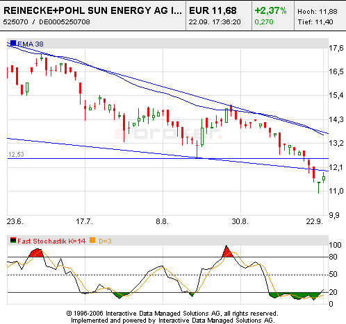 Nach Analystenprognosen soll sich der Gesamtumsatz des Solarspezialisten 2006 auf rund 116 Mio. Euro belaufen. Allein auf dem europäischen Solar-Boommarkt Spanien erwirtschaftete Reinecke + Pohl in den ersten sechs Monaten des Jahres 2,9 Mio. Euro. Derzeit befindet sich das Unternehmen nach eigenen Angaben in weiteren Verhandlungen über konkrete Projekte, die noch im laufenden Jahr umgesetzt werden sollen. Dabei setzt der Solarspezialist auf strategisch wichtige Partnerschaften mit vielversprechenden lokalen Projektierern. "So erschließen wir neben dem boomenden spanischen Markt auch die anderen südeuropäischen Wachstumsmärkte wie Italien, Griechenland oder Frankreich", erklärt Vorstandssprecher Martin Schulz-Colmant.