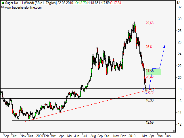 Wegen der rekordhohen Zuckerernte in Brasilien dürfte das Angebot in den nächsten 12 Monaten wieder ausreichend sein, aber die Nachfrage nach Ethanol und Zucker aus Schwellenländern wie China und Indien steigt weiter, so dass man ab 2011/2012 wieder mit der nächsten, vermutlich noch gewaltigeren Zuckerhausse rechnen muß, die den Preis Richtung 100 Cents treibt.