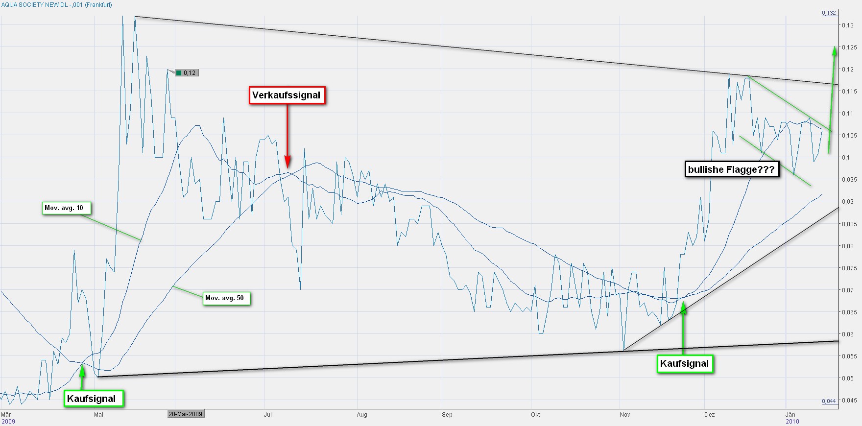 Frank Iding has been Chief Financial Officer and Treasurer of Aqua Society Inc. since September 2009. Mr. Iding has been Managing Director of Prescience AG since 2007. Mr. Iding has been Joint Managing Director of Arpolith GmbH since 2008. Mr. Iding has wide international experience gained through his work for the two companies. Mr. Iding served as Chief Executive Officer of the Sefinor Group - a group of companies based in the UK, Germany, Switzerland and elsewhere specialising in landmine and unexploded ordnance clearance and risk management. Mr Iding was responsible for the group's operations in Iraq, Afghanistan, Mozambique, Angola, Somalia, Kuwait, Cambodia, Bosnia, Kosovo, Russia, Vietnam, the US, UK and othercountries. From 2000 to 2007, Mr. Iding served as Managing Director of Volme-Draht GmbH. He has been a Director of Aqua Society Inc. since September 2009.nachdem in diesem Thread nur Fundamentaldaten erwähnt werden habe ich mich an einer Chartanalyse versucht. Kann an einem "Penny-Stock" überhaupt eine technische Analyse durchgeführt werden??? Wenn ja, was haltet ihr davon? Stehen wir wirklich bald bei 0,2€ (ca. + 100%)?