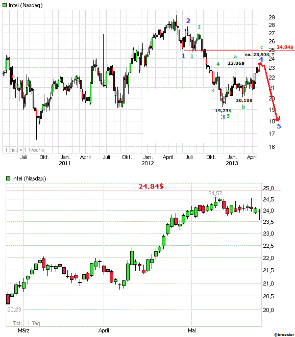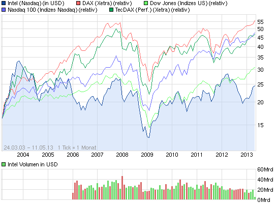 Die Intel sieht fundamental für mich ganz gut aus. Intel hat sich drangemacht, ihre Schwachstellen beim Stromverbrauch beim neuen Atomprozessor auszumerzen. Und die Haswell-Prozessoren bringen eine starke Steigerung der Grafikleistung. Beim Thema LTE arbeitet Intel noch daran, sie in die Prozessoren zu integrieren - bisher (leider noch) mit neuem externen Chip mit wenig Stromverbrauch. Zudem litt Intel in den letzten Wochen unter dem Trauertenor des PC-Todes. Der wird jedoch nicht kommen.Wer vernünftig abreiten will, brauicht einen Desktop, oder zumindest einen Laptop/Notebook. Ich will eine Tastatur und keine Rumwischerei auf dem Bildschirm. Und ich denke, ich bin damit nicht alleine.