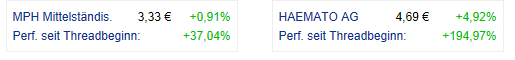 Ich konnte vom Anstieg bei Haemato stark profitieren und habe mir letzte Woche auch eine dicke Position MPH ins Depot gelegt. Die hohe Dividendenrendite sollte man auch beachten.