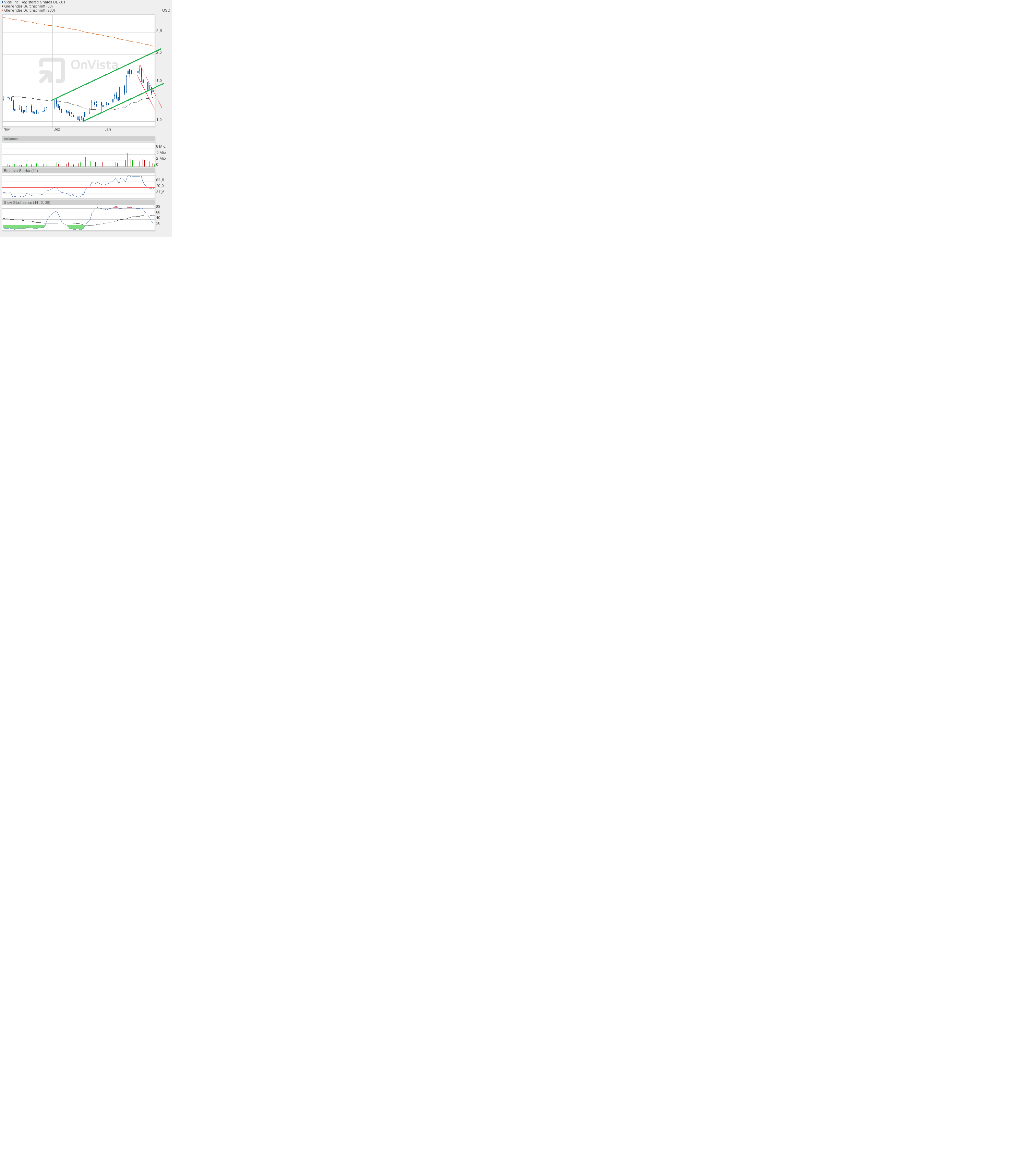Man muss immer erst mal schauen, wann man einen neuen Trendkanal einzeichnen kann. Nach den Gewinnmitnahmen der letzten Tage hat sich logischer Weise eine Abwärtstendenz abgezeichnet. Nach dem gestrigen Handelstag lässt sich nun auch ein genauer Trendkanal dazu festlegen. Das Tageshoch 1,45$ erreichte damit die Kanaloberbegrenzung. Der Schlusskurs bleibt unverändert bei 1,38$, womit aber der grüne Aufwärtstrendkanal noch immer intakt ist.