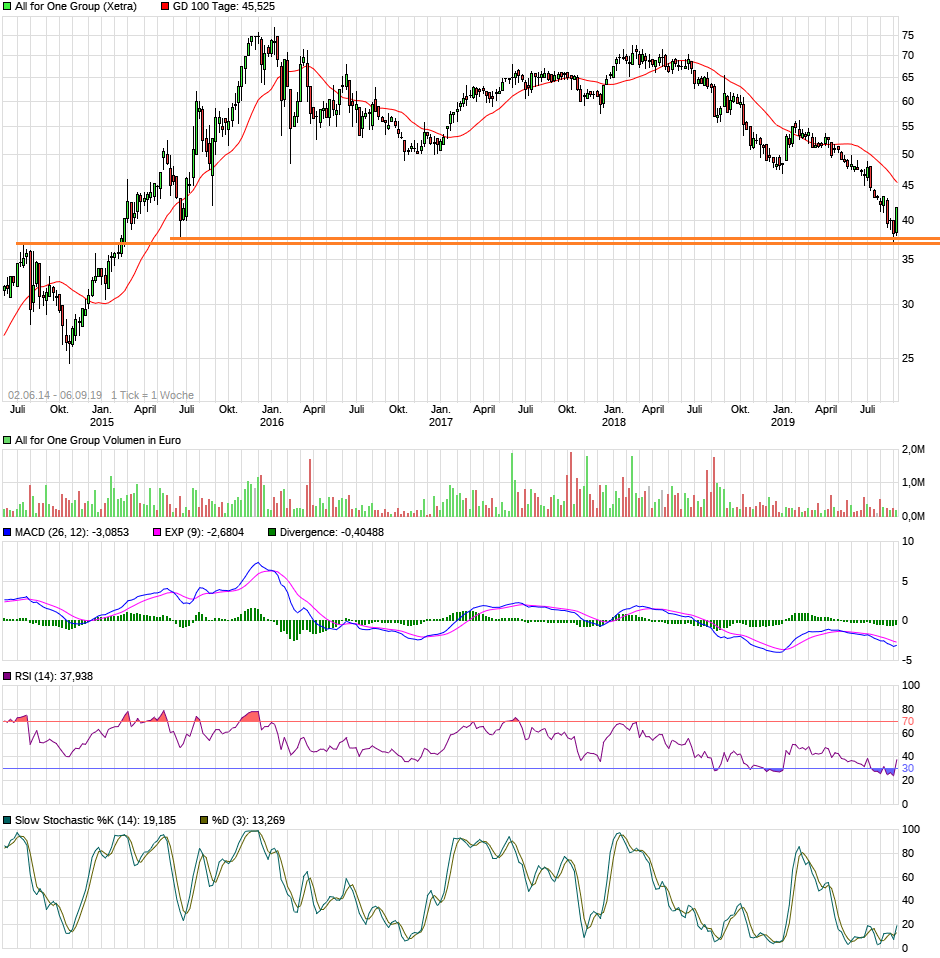 Den Anfang macht der Weekly, wo man schon sehr deutlich sieht, wie wichtig der Bereich 37,0-37,8 € ist. Zumal man im RSI hier auf einem extremen Niveau angelangt ist.