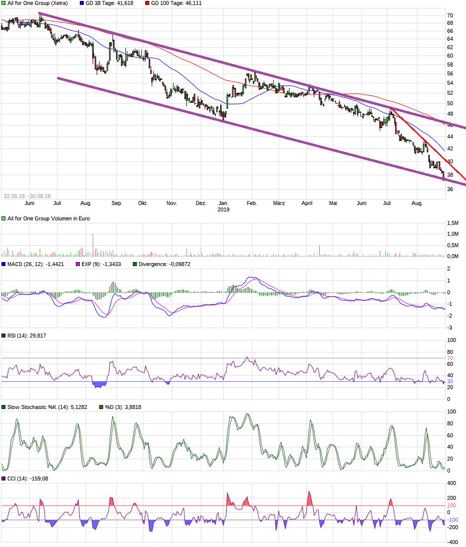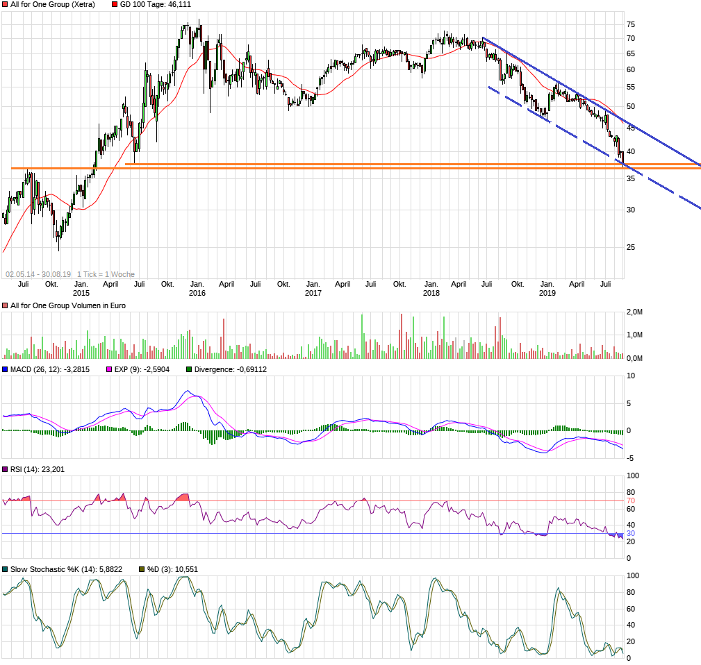 Durch dieses langsame aber stetige gibt es irgendwie nicht diesen Ausverkauf, wo man dann sagen könnte, jetzt ist es überstanden. Vielleicht kommt das ja noch, vielleicht mal 15-20k Aktien, die bei 37-38 € den Besitzer wechseln und dann mit ner grünen Kerze den Trendwechsel einleiten. Aber aktuell siehts irgendwie nicht danach aus.