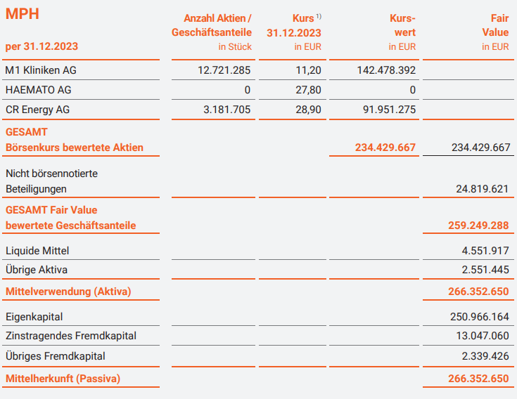 | - Beteiligung M1 Kliniken AG (Aktienzahl 31.12.23) | 12.721.285 | 21,75 | 276,7 | |