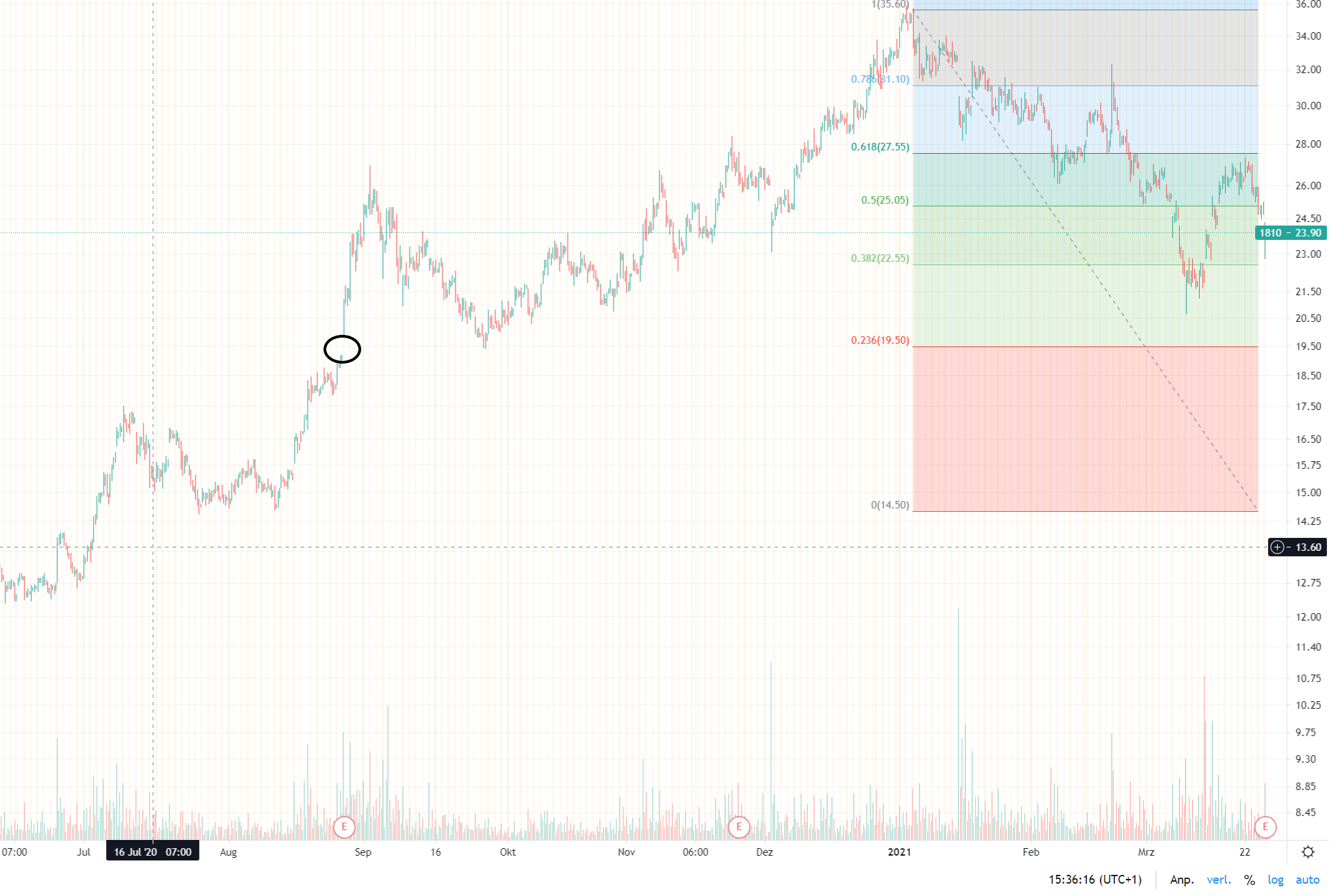 Aus dieser Störung konnte sich der Wert noch nicht befreien. Im ersten Teil der Konsolidierung war denkbar, dass der Kurs auf die Unterstützung der Konsozone des letzten Jahres um 2,35 – 2,55 € zuläuft und abprallt; das hat genauso wenig getan wie zum Zeitpunkt der Ergebnisse neu zu starten (im Bild die beiden Kringel).