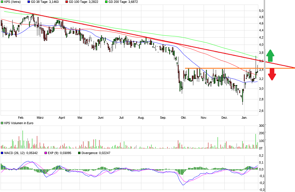 Abwarten, das Vertrauen hat KPS ziemlich verspielt Erstmal muss der Abwärtstre­nd nach oben signifikan­t durchbroch­en werden. Im Chart von Katjuscha gut zu sehen. Solche Ausschläge­ hatten wir schon früher und dann ging es weiter runter! Von KPS unveränder­t Funkstille­ zur Lage/Entwi­cklung/Aus­sichten, usw. Woher soll Phantasie für Anleger zum Einsteigen­ kommen? Sollten die Zahlen noch enttäusche­n, na ja...