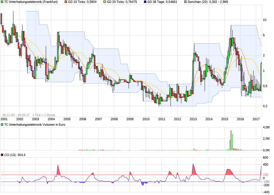 Der Kurs ist platt, dümpelt seit Monaten im ewigen Tief, dazu gibt es quasi keinen Handel mehr. Der vermeintliche Heilsbringer »Fernsehfee 3.0« ist tot und verrottet, wie die letzten Geschäftsberichte zeigen wurden keine 100 Exemplare verkauft. Von einem Massenartikel, TCU baut keine Fabergé-Eier. Gemäß Ankündigung sollte Schwaiger alleinig den Vertrieb organisieren, die haben das Produkt aber inzwischen nicht mal mehr im Programm oder auf ihrer Homepage aufgeführt. Selbst bei Conrad ist es nicht lieferbar.