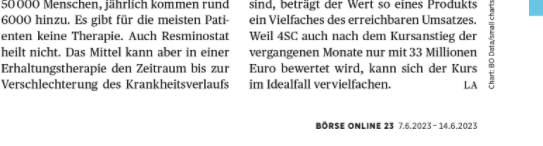 Ein anderer Aspekt: Die Strüngmänner haben nach meiner Erinnerung KE`s in Höhe von damals (vor dem Re-Split) teilweise weit über 2 €, also heute > 10 €, gezeichnet. Das bedeutet, dass die jetzt erst im grünen Bereich sind. Ebenso die Personen, die "familiar" waren bzw. sind. (Das wurde hier damals eingehend diskutiert.) Ich glaube aber nicht, dass die jahrelang eine Firma wie 4sc finanzieren, um dann mit 40 oder 50% rauszugehen. Daher gehe ich davon aus, dass da noch wesentlich mehr kommt und sehe das Kursziel eher zwischen 40 und 50 € nach konservativer Schätzung wie oben beschrieben. Interessant ist in diesem Zusammenhang, dass BioNTech mit den Strüngmännern als Hauptanteilseigner vor einigen Wochen angekündigt hat, sich nach Corona nun wieder der Krebsforschung/-bekämpfung zu widmen. Insofern könnte ich mir durchaus eine Übernahme durch BioNTech vorstellen, die für die Strüngmänner letztlich nur eine interne Verschiebung wäre, wenn man die Behandlung mit Resminostat ggf. als Unterstützung der Behandlungsansätze und Therapien bei BioNTech ansieht bzw. damit kombinieren kann.