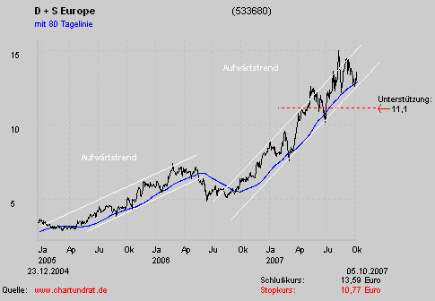 Rückblick: Die D+S EUROPE Aktie befindet sich in einer langfristigen Aufwärtsbewegung. Seit Anfang Juli 2007 notiert der Wert konstant über einer wichtigen Pullbacklinie. Nah einem Hoch 15,15 Euro korrigiert sie nun seitwärts, wobei sich die Handelsspanne zu einem Dreieck verengt. Diese Seitwärtskorrektur hat nach der vorangegangenen Rallye bullischen Charakter und deutet eine Fortsetzung der übergeordneten Aufwärtsbewegung an.