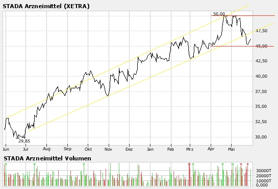 Den Titel hab ich länger auf meiner Pharma-Watch, sieht ganz gut aus: IMHO gibt's Chancen, dass der Kurs wieder in den gelben Trendkanal zurückkehrt, d.h. Kurse über 47,50 sollten bald drin sein. Bei Überschreiten der 50€ ist der Weg nach oben frei; bei Unterschreiten der 45€ würde ich mich schnell wieder verabschieden.