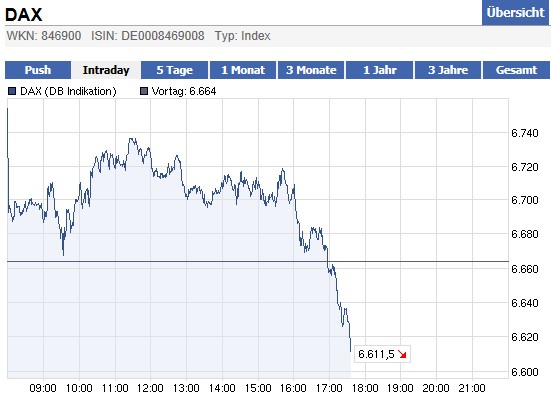 FRANKFURT (dpa-AFX) - Der Dax (DAX) hat am Dienstagnachmittag im Zuge schwächerer US-Börsen weiter nachgegeben. Zuletzt verlor der Leitindex 1,37 Prozent auf 6.682,25 Punkte, nachdem er kurz zuvor sein Tagestief bei 6.665,74 Punkten markiert hatte. Angesichts der Sorgen über die Weltwirtschaft bleibe die Erholung an den Aktienmärkten vorerst aus, hieß es von Marktbeobachtern. Zu dem schwachen US-Arbeitsmarktbericht vom Karfreitag kämen als Belastungsfaktoren die wieder stärker in den Vordergrund rückende Schuldenkrise in Europa sowie enttäuschende Wirtschaftsdaten aus China hinzu./ajx/he