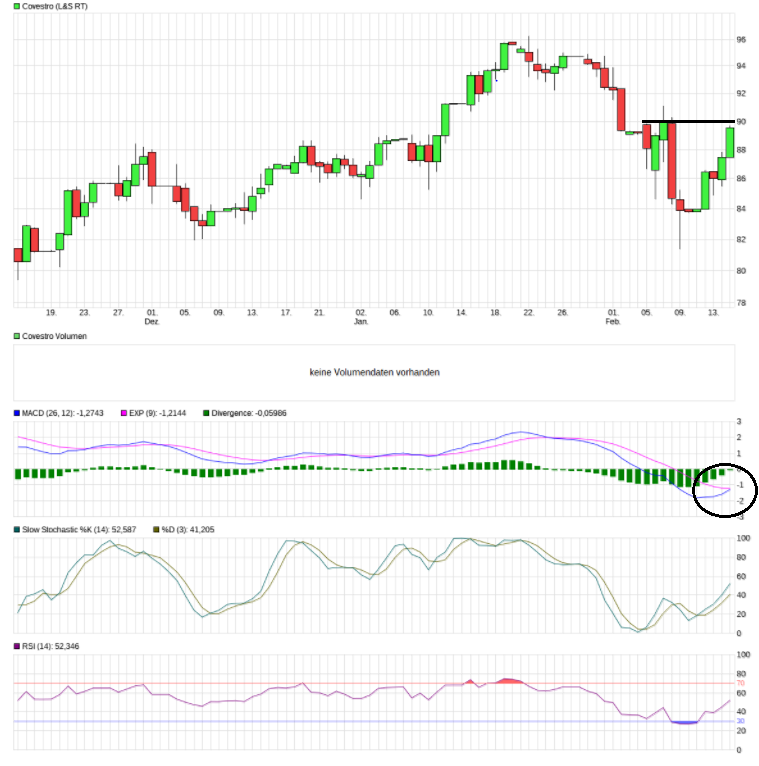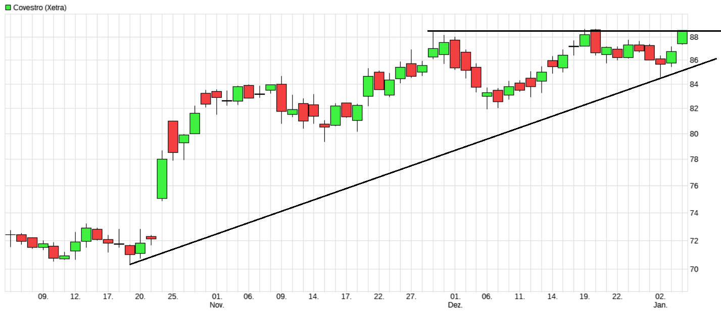 Das Dreieck spitzt sich weiter zu und mehrheitlich kommt es vorher schon zu einem Ausbruch in die eine oder andere Richtung. Die Chancen auf einen Ausbruch nach Norden stehen gut. Der Gesamtmarkt wirkt wieder freundlicher und somit könnte Covestro weiter Kurs Richtung 100 Euro nehmen.