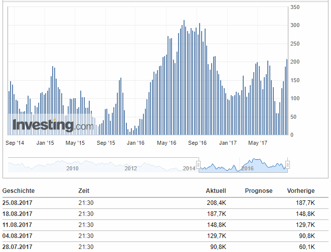 USD 1.274 (Schlusskurs) am Do, 31.8.2017 und die Aufwärtstrendlinie 12/2016 im Monatschart bleibt unbeschädigt. Dafür muss das bereits oben angesprochene Unterstützungsfenster halten.