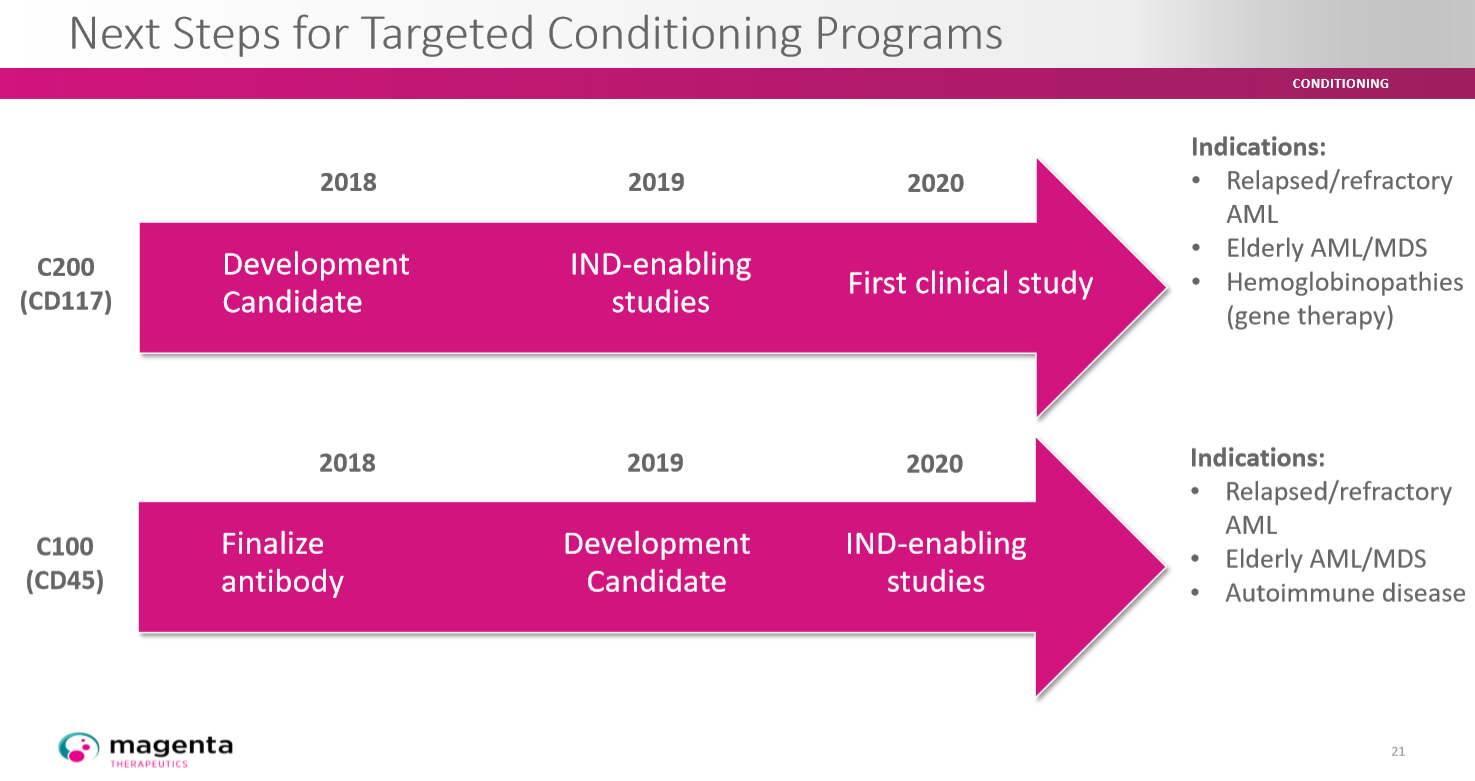 Updated preclinical data for C100 conditioning program showed potent depletion of hematopoietic stem cells and immune cells: At the Transplant and Cellular Therapy (TCT) meeting in February 2019, Magenta presented data from its C100 targeted conditioning program, showing potent stem and immune cell depletion with an anti-CD45 amanitin antibody-drug conjugate (ADC) that was well tolerated at efficacious doses in non-human primates. The Company expects to declare a development candidate for this program in 2019 and intends to develop C100 in both autoimmune diseases and blood cancers.