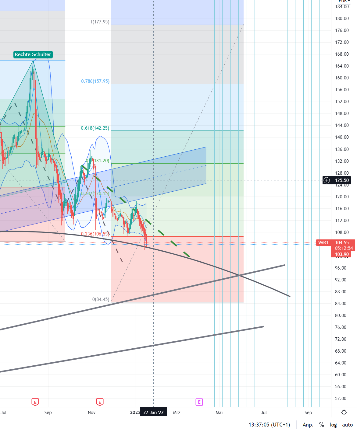Mein Einsteiger „Toolbox“ sagt im Moment, dass es hier bei 96 wenden könnte. Zum einen ist der RSI auf Wochenchart nach unten rausgelaufen (leicht überverkauft), Welle von Corona-Tief (mit 165,90 als 5) ist bis 61,8er (bei 96,18) zurückgekommen. Fundamental sehe ich bisher keinen groben Fehler, nur Verzögerungen.