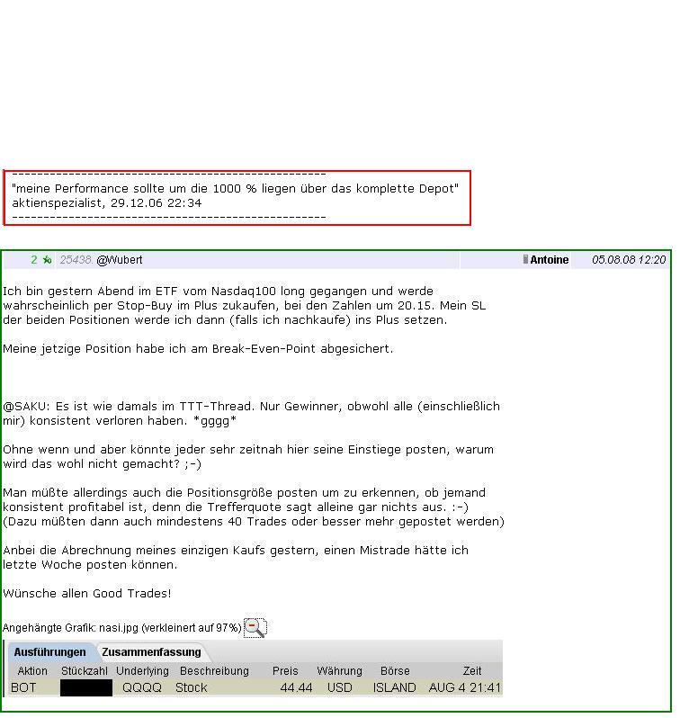 Ich gehe sogar einen Schritt weiter als trash76 und sage, daß man sein Konto komplett offen legen sollte, wie es auf einigen US-Sites gezeigt wird. No papertrading, no fake, real money, real account.