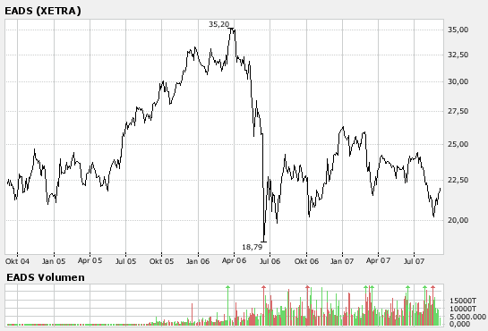 Die Aktie von EADS notiert aktuell mit einem Minus von 1,49 Prozent bei 23.83 Euro. (21.06.2007/ac/n/d)
