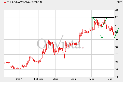 Am 10.04.07 hatten wir uns positiv zur TUI-Aktie geäußert. Da inzwischen unser erstes Kursziel in Form der Widerstandszone bei 19,54/20,91 EUR (verschiedene alte Hochpunkte), erreicht wurde, ist es Zeit für ein Update zu unserer damaligen Analyse. Die ausgeprägten Dochte der letzten beiden Tageskerzen lassen auf signifikante Angebotsüberhänge im Bereich der oberen Widerstandsbegrenzung schließen. Die bisherige Wochenkerze ist sogar als „shooting star“ zu klassifizieren.