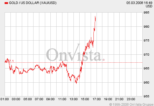 Setzt Gold seine Rallye unbeirrt fort oder sind die 1.000 US-Dollar dann doch des Guten zuviel? Noch keine zwei Monate ist es her, da durchbrach der Goldpreis sein bis dahin gültiges Allzeithoch von 850 US-Dollar je Feinunze. Dem Markt schien keine Grenze mehr gesetzt zu sein und in der Tat erreichte Gold zu Wochenbeginn fast die 1.000 Dollar Marke. Nur wenige US-Dollar fehlten. Grund für die anhaltende Gold-Hausse ist vor allem die Sorge vor einer massiven Abschwächung der US-Wirtschaft, dem schwachen Dollar und der bestehenden Inflationsgefahr. Das Gefühl der wirtschaftlichen Unsicherheit dominiert derzeit und löst bei einem äußerst nervösen Konstrukt, wie der Börse, eine nicht unnatürliche und im Zeitablauf oft zu beobachtende Reaktion aus. Die Anleger setzen auf das Edelmetall. Besonders vor einer drohenden Inflation greifen die Anleger auf das traditionell erprobte Mittel zurück, zumindest einen Teil ihres Vermögens durch ein Goldinvestment zu sichern. Gold lässt sich nicht beliebig vervielfältigen wie etwa die zum Teil baumwollhaltigen Scheine der jeweiligen Notenbanken und eignet sich folglich gut zum Werterhalt. Zudem ist die Minenproduktion schon seit geraumer Zeit rückläufig und die Exchange Traded Funds fragen zunehmend Gold nach, um ihren Handel damit real zu unterlegen, was die Preisentwicklung ebenfalls stützt. Gestern wurde der ISM-Einkaufsmanagerindex für das verarbeitende Gewerbe veröffentlicht, welcher Daten über die Lage und das Klima der US-Wirtschaft bereit hält. Er fiel wie erwartet schwach aus und konnte ergo keinen gegenläufigen Kursausschlag beim Gold hervorrufen. Morgen folgt der ISM-Index für den Dienstleistungssektor und am Freitag die Arbeitsmarktdaten für die USA, welche jedoch offenkundig keine Informationen enthalten dürften, die die Preisentwicklung noch ausbremsen könnten. Warren Buffet äußerte sich kürzlich mit den Worten: „Nach jeder vernünftigen Definition befinden wir uns in einer Rezession.“ Zuletzt verlieh Fed-Chef Ben Bernanke dem Goldkurs durch seine aggressive Zinssenkungspolitik zusätzlichen Auftrieb. Er nimmt dem 1.000 Dollar-Szenario damit jegliche Anhaftung der Utopie und lässt es fast zu einem emotionslos erwarteten Ereignis mit einer Eintrittswahrscheinlichkeit von 100 Prozent mutieren.