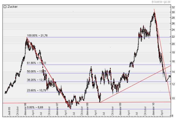 Mittel- bis langfristiger Chart für Zucker mit dem Fibonacci Retracement.