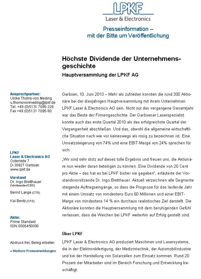 10.06.2010 (www.4investors.de) - Die Hauptversammlung von LPKF hat der höchsten Dividende der Unternehmenshistorie zugestimmt. Je Aktie erhalten die Anteilseigner demnach eine Dividende von 0,20 Euro. Im Vorjahr hat LPKF keine Dividende ausgeschüttet.